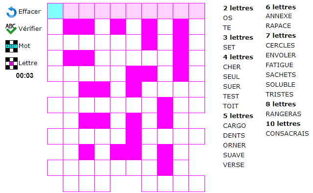 Casse tete 8 lettres. Solution casse tête métal - YouTube Voici comment résoudre un petit casse tête ;-) Casse-tête : synonymes et définition Afin de vous aider dans vos mots croisés ou mots fléchés, nous avons classé les synonymes de Casse-tête par nombre de lettres. Synonymes de Casse-tête en 5 lettres : Souci. Ennui. Masse. Synonymes de Casse-tête en 6 lettres : Tracas. Massue. Trique. Puzzle. Synonymes de Casse-tête en 7 lettres : Cabaret. Embûche. Des devinettes casse-tête pour se creuser les méninges Réponse. Il fait passer la chèvre en premier puis va chercher le chou. En emmenant le chou sur la rive d'en face il reprend la chèvre pour la ramener sur la première rive. Il dépose à nouveau la chèvre et prend le loup qu'il fait traverser et laisse avec le chou. Enfin, il va chercher la chèvre et tout le monde est sain et sauf! Mot Mystere gratuit en ligne - Mot mystere Online Mot Mystere à trouver de 8 lettres. Jeu Mot Mystere en Ligne Cliquer sur l'image pour voir le mot mystere du jour. Mot mystere du jour Pour jouer au mot mystere, vous devez trouver les mots soit verticalement, soit horizontalement ou diagonalement. Les mots dans le mot mystere peuvent etre dans les deux sens.
