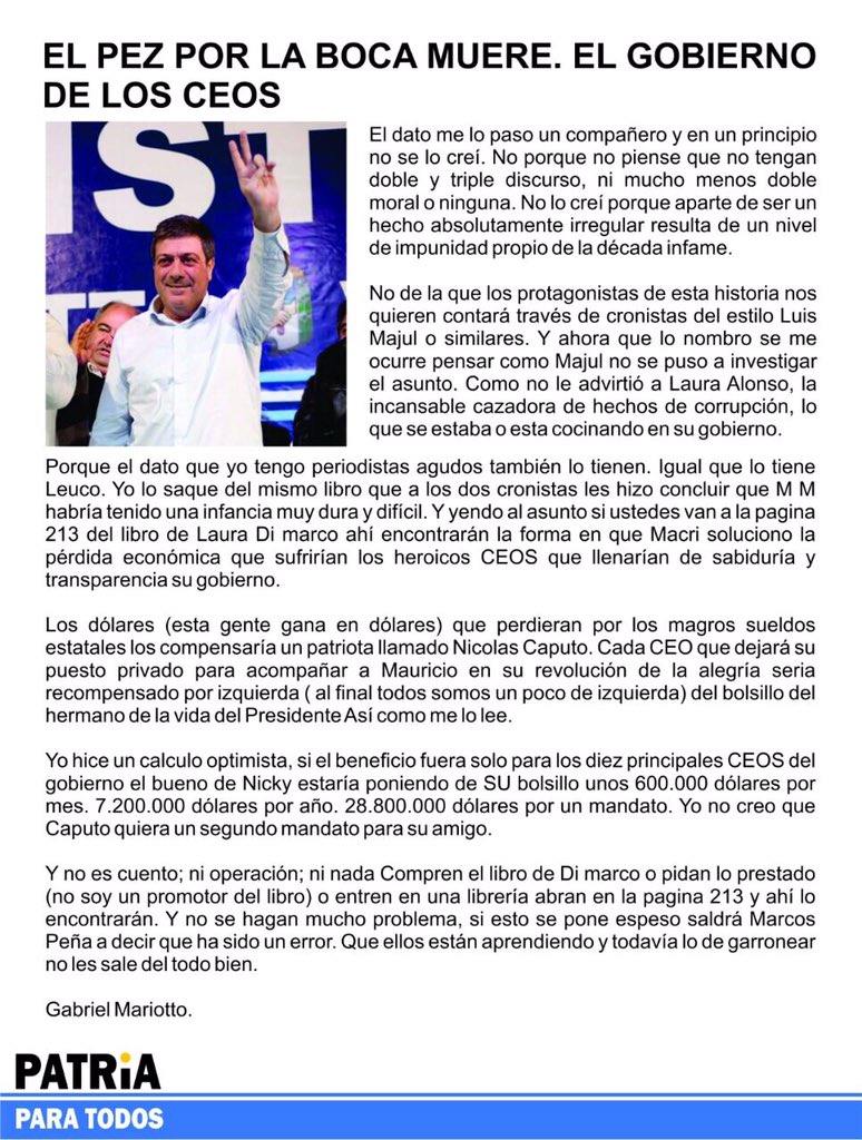 Encuentra aquí información de Octubre, un crimen; Norma ... A partir de los datos que obtienen se llega al final del libro. Desenlace: El final del libro es medio confuso, Inés y Amparito quedan en que Maria del Carmen se había casado con el doctor De Bilbao, habían puesto el geriátrico con la plata del crimen y a Malu la habían asesinado también. Pero Inés recuerda cuando estuvo en el geriátrico y vio el álbum del casamiento del doctor De Bilbao y la bata que le presta la esposa del doctor, ve las iniciales M.L. Textos- Texto de Descartes: el discurso del método Si este discurso parece demasiado largo para leído de una vez, puede dividirse en seis partes: en la primera se hallarán diferentes consideraciones acerca de las ciencias; en la segunda, las reglas principales del método que el autor ha buscado; en la tercera, algunas otras de moral que ha podido sacar de aquel método; en la cuarta, las razones con que prueba la existencia de Dios y del alma humana, que son los fundamentos de su metafísica; en la quinta, el orden de las cuestiones de ... PDF Discurso persuasivo escrito - Universidad Autónoma de ... Ahora conoce los pasos para escribir el guion de tu discurso persuasivo: ¡Decídete! Elige un tema que puedas profundizar en la cantidad de tiempo que se te otorga. Debes tener claridad en el efecto que quieres lograr. ¡Empatiza! Incluye una razón sobre el porqué de tu discurso, usa hechos Un saco de libros | Danilo P. on Instagram: "📓Muñeco de ... El autor, es el Ragdoll, quien dejará una carta, con fechas de quienes serán sus seis víctimas siguientes. 📚 A pesar de tener algunas cosas típicas de novela negra, estas están trabajadas de forma original y eso es admirable. Este libro no te da descanso, te atrapa y te deja con las ganas de seguir leyendo.