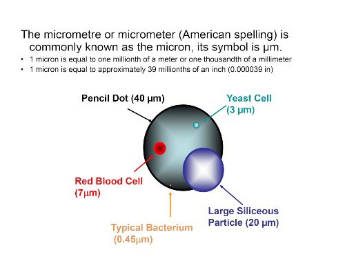 The size of dust particles, pollen, bacteria, virus and many more. one micron is one-millionth of a metre. falls slowly, take days to years to settle out of a quiet atmosphere. In a turbulent atmosphere they may never settle out. can be washed out by water or rain.