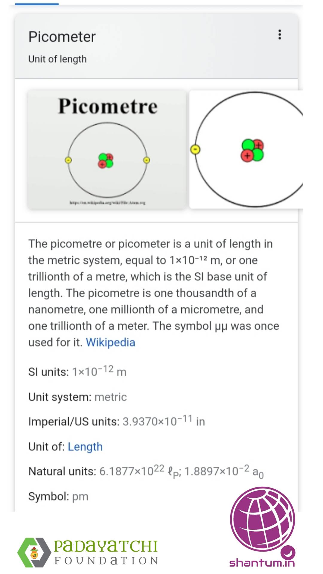 Picometre - Wikipedia The picometre is one thousandth of a nanometre (1 / 1000 nm), one millionth of a micrometre (also known as a micron), one billionth of a millimetre, and one trillionth of a metre. The symbol μμ was once used for it. It is also one hundredth of an ångström, an internationally known (but non-SI) unit of length. Use