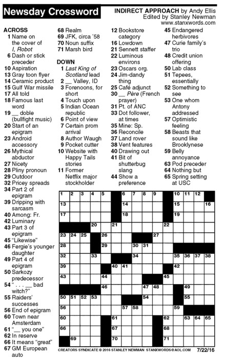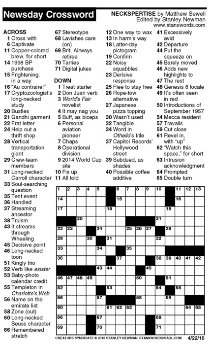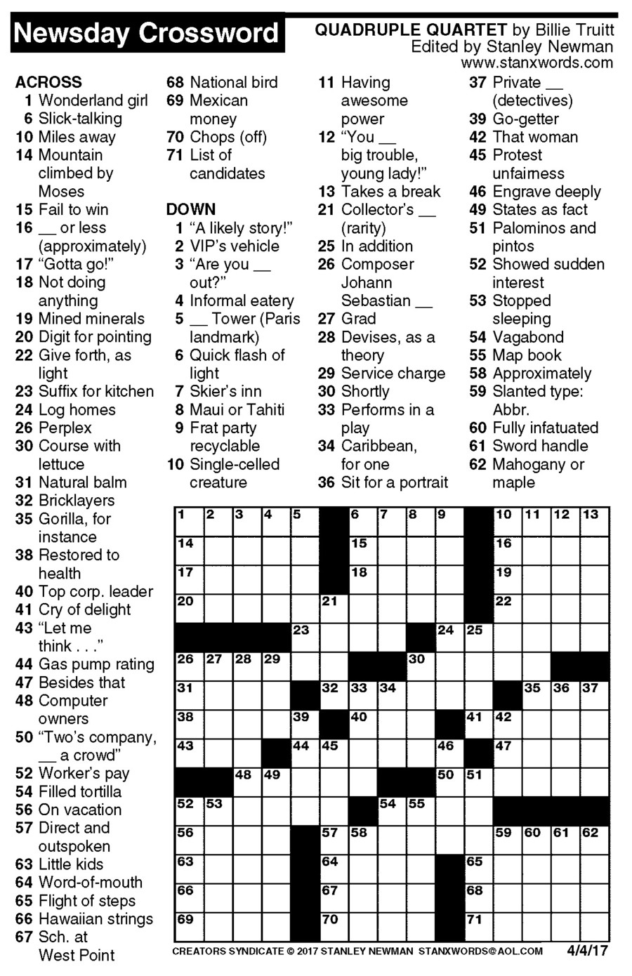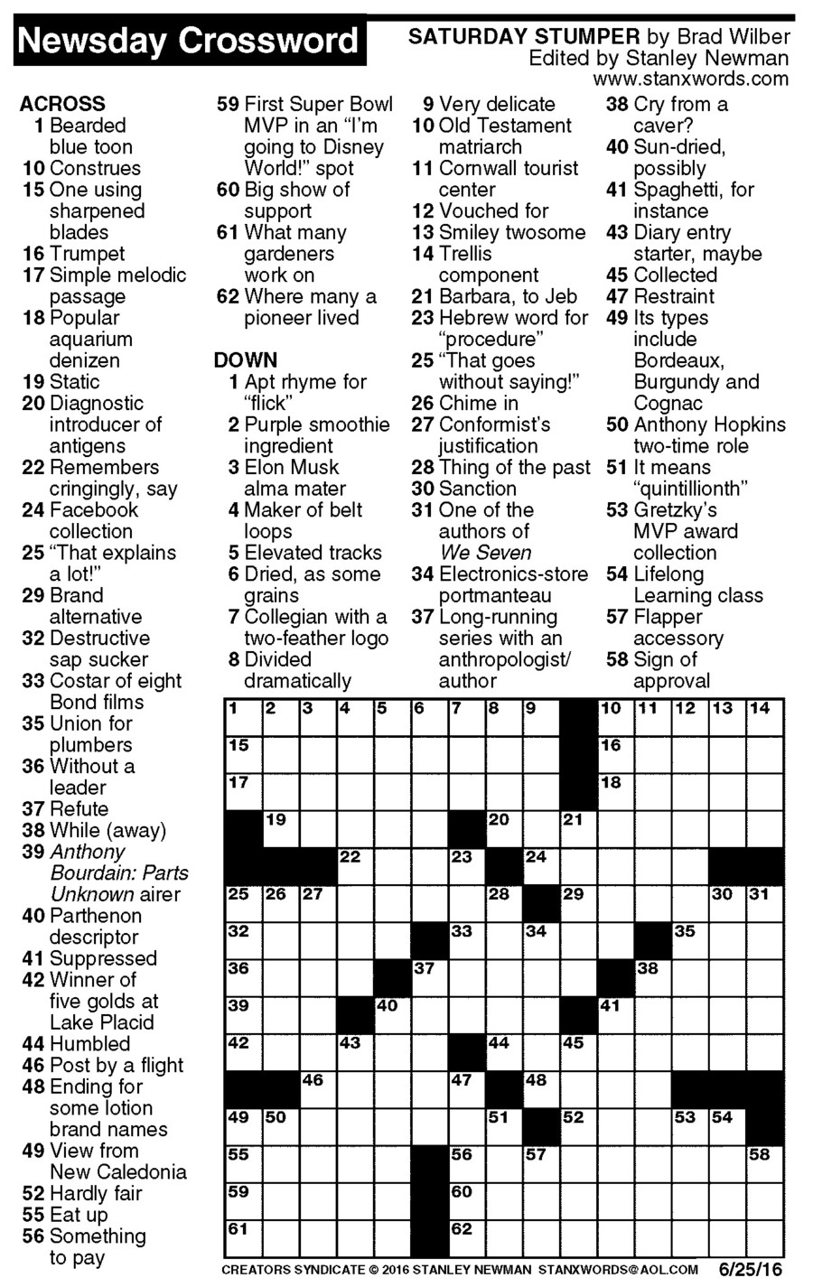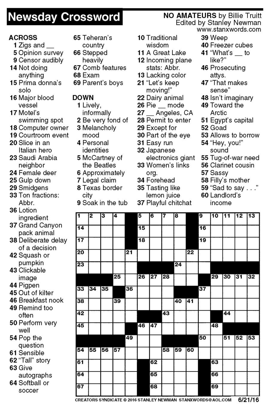 Crossword Answers, Crossword Solver Though, even rookies have trouble solving all of the crossword clues in their game. The good news is, when you can’t resolve a clue, you can plug in the clue into the crossword clue solver tab and scroll through all your potential options outlined in the rich clue lists. You can even click on the words for dictionary definitions. Newsday Crossword Puzzles The Newsday Crossword Puzzle is published daily under the entertainment section of the Newsday newspaper. Daily puzzles are created by regular as well as individual contributors and are edited by Stanley Newman. Newman has been the editor of the Newsday Sunday Crossword since March 1998 and editor of the Newsday daily crossword since January 1992. Newsday Crossword February 16 2022 Answers - Answers.org Newsday Crossword February 16 2022 Answers PLEASE NOTE: Clicking on any of the crossword clues below will show you the solution in the next page Across Wastes time doing nothing Ooh and __ Engrave deeply Give feedback Blueprint detail, for short Sneaker or pump Instrument played by humming Prefix for chute Apple or pear Sneaky Having no choice Puzzles - Newsday Puzzles - Newsday. Long Island Sports Newsday TV News FeedMe Opinion Business Obituaries Newsday Live Search. 54 °04/24/2022 Good afternoon.