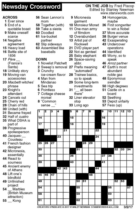 Newsday Crossword - Answers.org Newsday Crossword Newsday Crossword January 22 2022 Answers Written by bible January 21, 2022 Here you will be able to find all today's Newsday Crossword January 22 2022 Answers. For everyone that is enthusiastic about solving crosswords and are looking forward to challenging their brain power then the Newsday daily crossword is the perfect option. NewsDay April 6 2022 Crossword - Crosswordeg.com NewsDay April 6 2022 Crossword. You are on the NewsDay Crossword Publisher page. It was last updated on April 6 2022, and it has a total of 78 clues. Click on the clue you need to get the answer, which is given below. For no charge crossword clue. Comic strip scream crossword clue. Newsday Crossword Puzzle - Creators Syndicate Newsday Crossword Puzzle | Creators Syndicate Newsday Crossword Puzzle Newsday Crossword Puzzle Stan Newman crafts a fresh and challenging puzzle every day of the week! Stay sharp and challenge... NewsDay April 25 2022 Crossword - Crosswordeg.com NewsDay April 25 2022 Crossword. You are on the NewsDay Crossword Publisher page. It was last updated on April 25 2022, and it has a total of 78 clues. Click on the clue you need to get the answer, which is given below. Dry as a desert crossword clue.