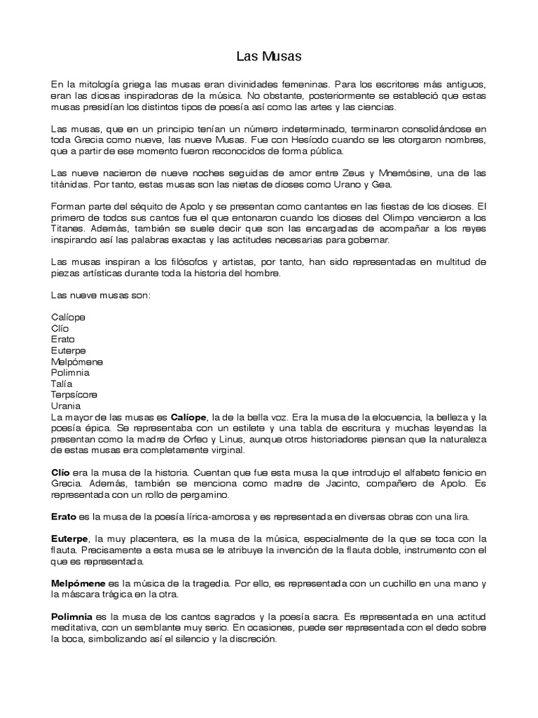 Mit. Musa de la poesía épica y de la elocuencia - Solución ... Musa de la poesía épica y de la elocuencia», podemos ofrecerte las respuestas más precisas para toda clase de encrucijada. Luego de realizar un examen completo a la base de datos, encontramos una cantidad de pistas Mit. Musa de la poesía épica y de la elocuencia con respuestas relevantes para tu crucigrama. Soluciones Codycross Musa de la poesía épica y la elocuencia Soluciones Codycross Musa de la poesía épica y la elocuencia. Si buscas la solución de juego :CodyCross para el enigma Musa de la poesía épica y la elocuencia, entonces estás en el tema correcto. De hecho, pude resolver todos los rompecabezas que te permitirán pasar al siguiente nivel. Musa De La Poesía Épica Y La Elocuencia - CodyCross Musa De La Poesía Épica Y La Elocuencia - CodyCross Aquí encontrará la solución exacta a Musa De La Poesía Épica Y La Elocuencia para continuar en el paquete CodyCross Planeta Tierra Grupo 3 Rompecabezas 2. Respuestas Musa De La Poesía Épica Y La Elocuencia CALÍOPE Anterior Siguiente Respuestas mismo Rompecabezas Musas A QUÉ SE DEDICAN Flashcards | Quizlet Musa de la poesía épica y de la elocuencia. Terpsícore. Musa de la danza. Euterpe. Musa de la música. Érato. Musa de la poesía amorosa. Polimnia. Musa de la poesía lírica. Urania. Musa de la astronomía, las matemáticas y la filosofía. Sets found in the same folder. Dioses GRECÍA - ROMA. 15 terms. paulisg.