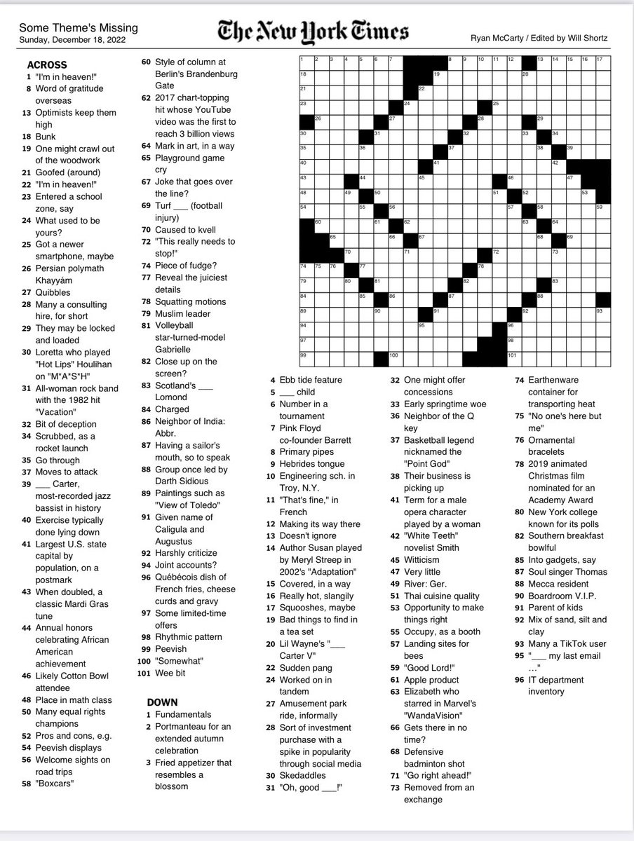 New York Times Crossword Puzzle | National Post New York Times Crossword Puzzle. Advertisement 2. Advertisement . This advertisement has not loaded yet, but your article continues below. Advertisement 3. Advertisement . The New York Times Supersized Book of Sunday Crosswords: 500 ... The New York Times is a daily newspaper published in New York City and distributed internationally. Founded in 1851, the newspaper has won 112 Pulitzer Prizes, more than any other news organization. Its website receives 30 million unique visitors per month. This and That - The New York Times Excited to have another Sunday crossword in The New York Times! Hopefully having circled words AND shaded words in the theme entries was a nice Sunday bonus and avoided turning into too much of a ... NYmag Crossword Puzzles: Daily & Weekly - New York Magazine The Vodka Sauce Puzzle 5-Down, Eight Letters: Hashtag on an undoctored photo. The Turkey Puzzle 1-Down, Four Letters: Way for a Disney villain to die, often. The New York Crossword: 'You Are ...