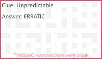 unpredictable (7) Crossword Clue | Wordplays.com Answers for unpredictable (7) crossword clue, 7 letters. Search for crossword clues found in the Daily Celebrity, NY Times, Daily Mirror, Telegraph and major publications. Find clues for unpredictable (7) or most any crossword answer or clues for crossword answers. Unpredictable Crossword Clue – NYT Crossword Answers Apr 21, 2023 · UNPREDICTABLE Crossword Answer FULLOFSURPRISES ERRATIC Advertisement Today's puzzle is listed on our homepage along with all the possible crossword clue solutions. Open the link to go straight there NYT Crossword Answers 04/11/23. When facing difficulties with puzzles or with our website, feel free to drop us a message. Advertisement Unpredictable - crossword puzzle clues & answers - Dan Word Unpredictable. Today's crossword puzzle clue is a quick one: Unpredictable. We will try to find the right answer to this particular crossword clue. Here are the possible solutions for "Unpredictable" clue. It was last seen in British quick crossword. We have 9 possible answers in our database.